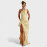 Šaty Ariel personifikují sluneční eleganci s jejich asymetrickým designem, který jemně zvýrazňuje výstřih a ramena. Tekutý satén objímá siluetu s nádechem luxusu, ideální pro zářivý vzhled na zvláštních událostech nebo nezapomenutelných nocích.