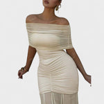 Objevte naše dlouhé pletené šaty, které jsou ódou na elegantní sensualitu. S odhalenými rameny a těsným střihem se dokonale přizpůsobují tělu, zatímco průsvitná sukně dodává pohyb a sofistikovanost každému vašemu kroku. Ideální volba pro speciální události s moderním a odvážným vzhledem.