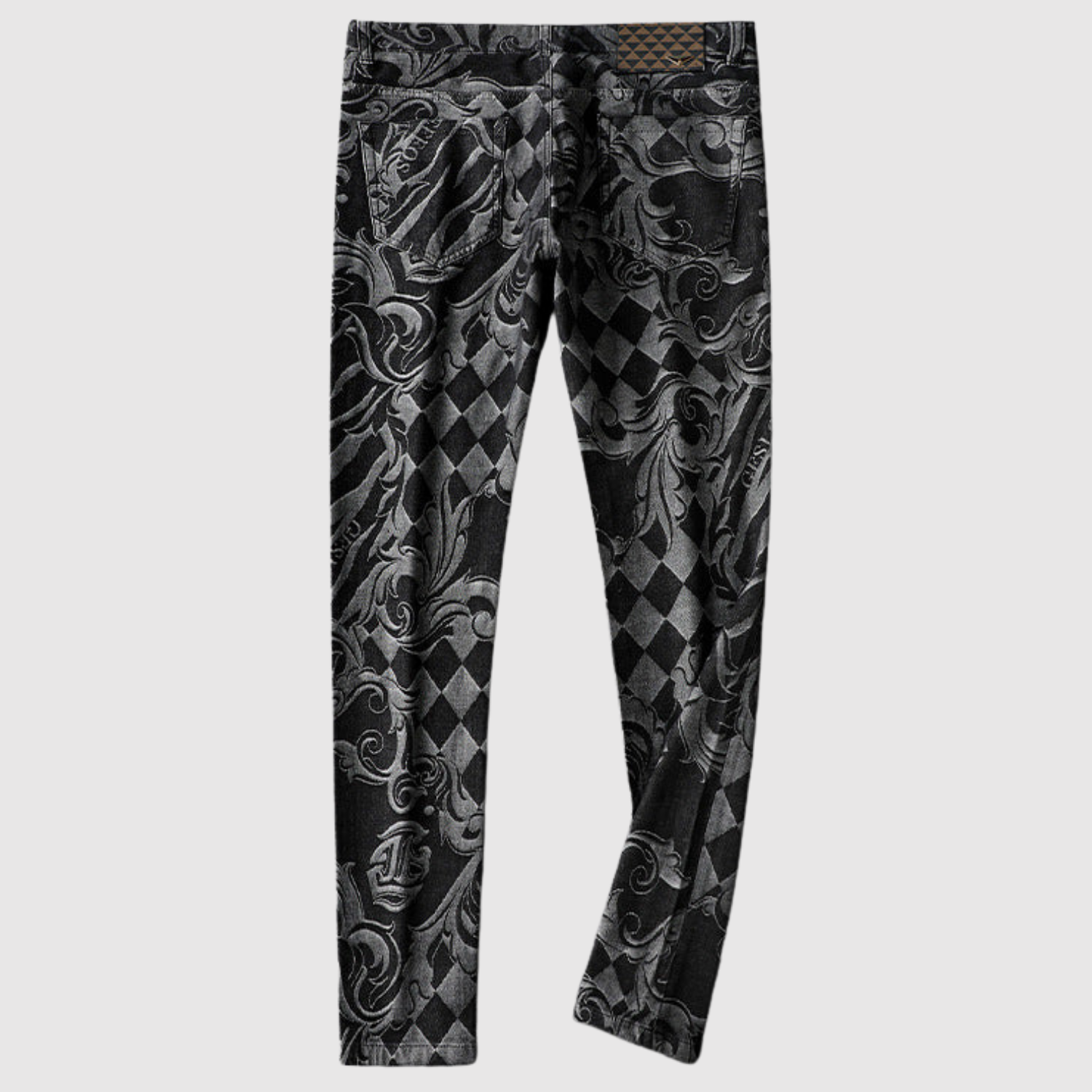 Objevte džíny, které kombinují barokní křivky s harlekýn inspirovanými diamanty pro odvážný a nadčasový vzhled. Detaily jako barevný patch a kovová embléma podtrhují exkluzivní charakter.