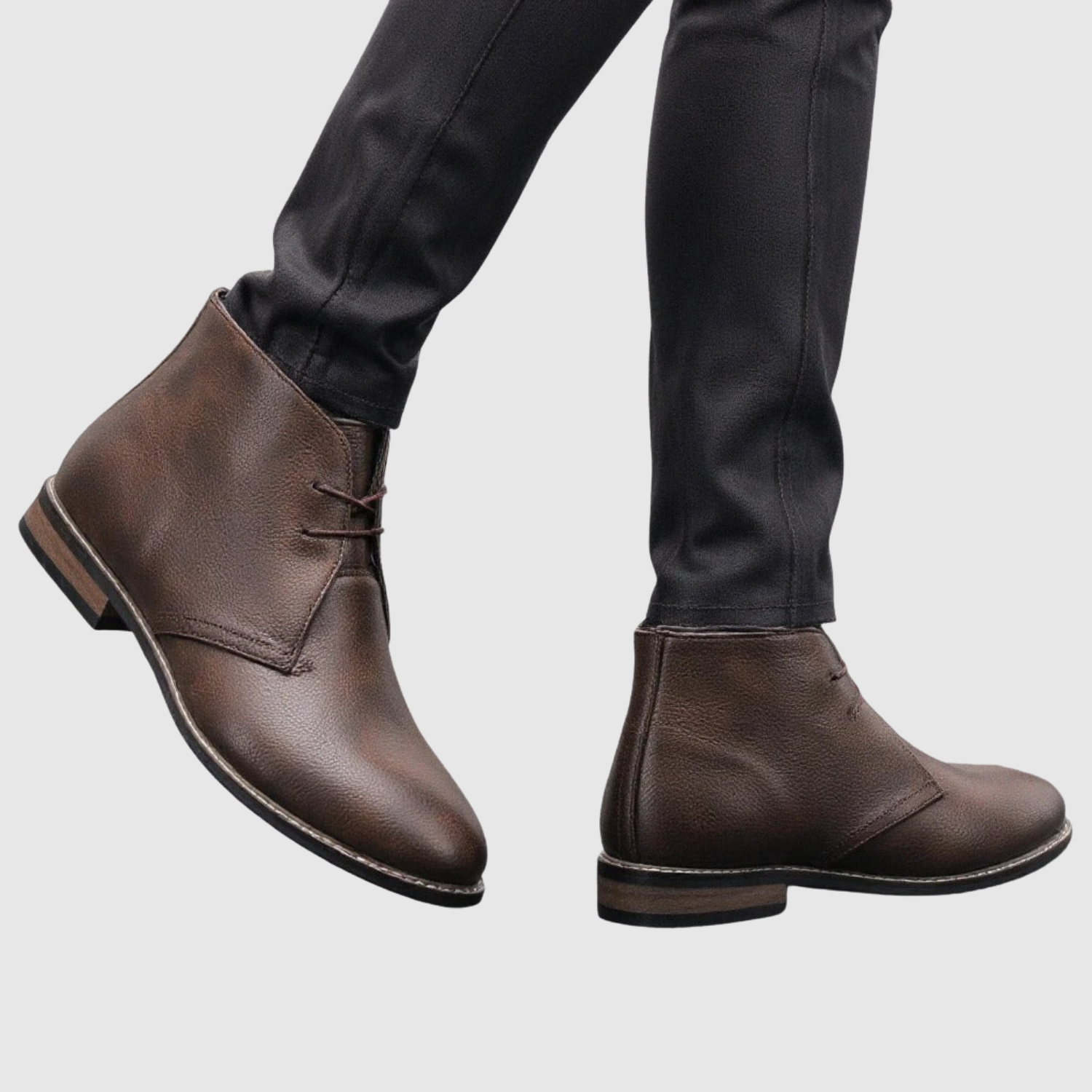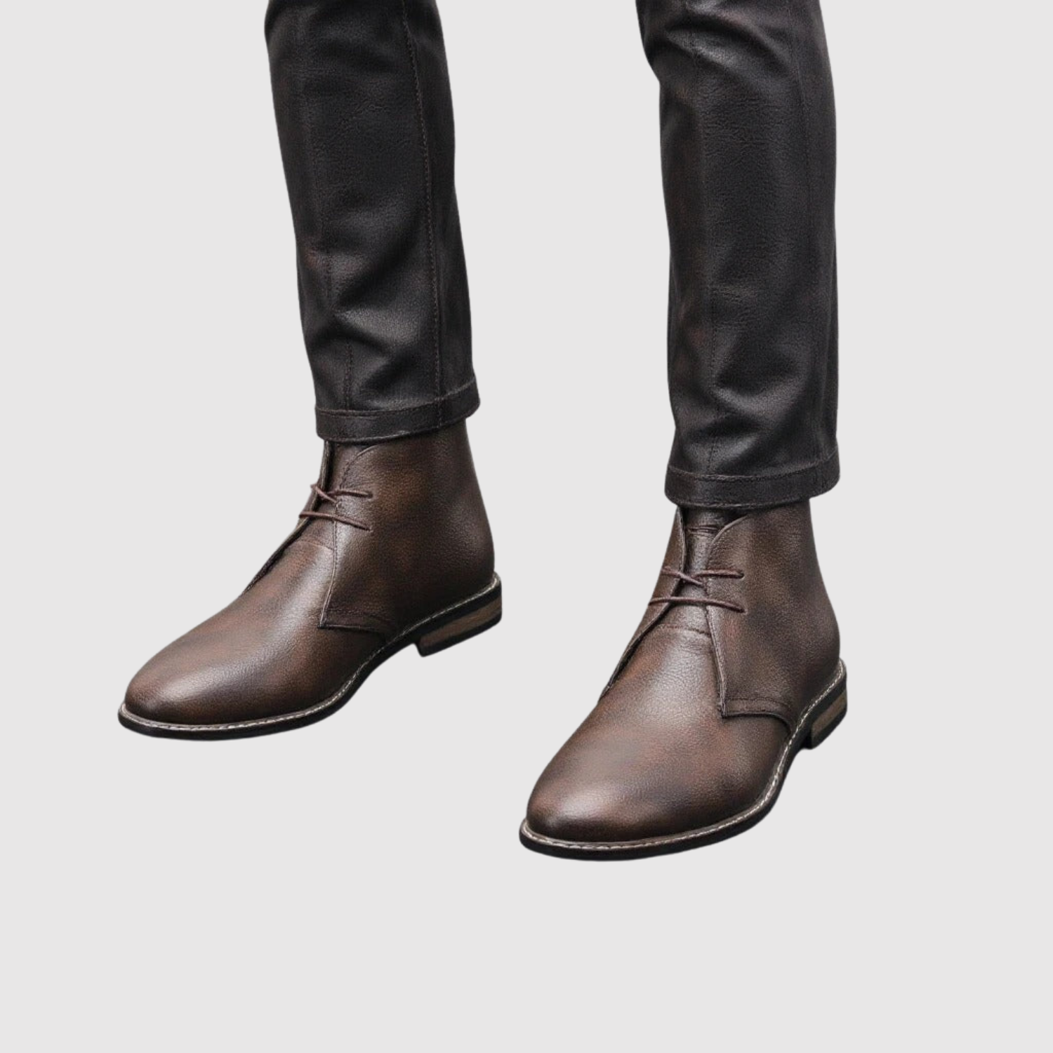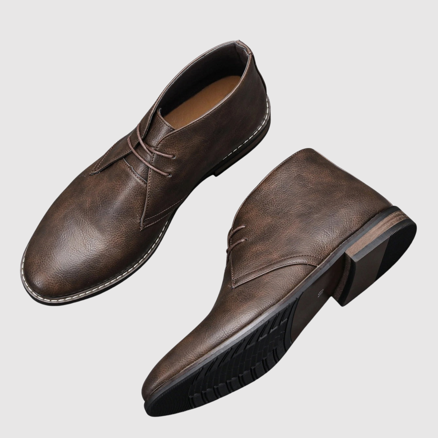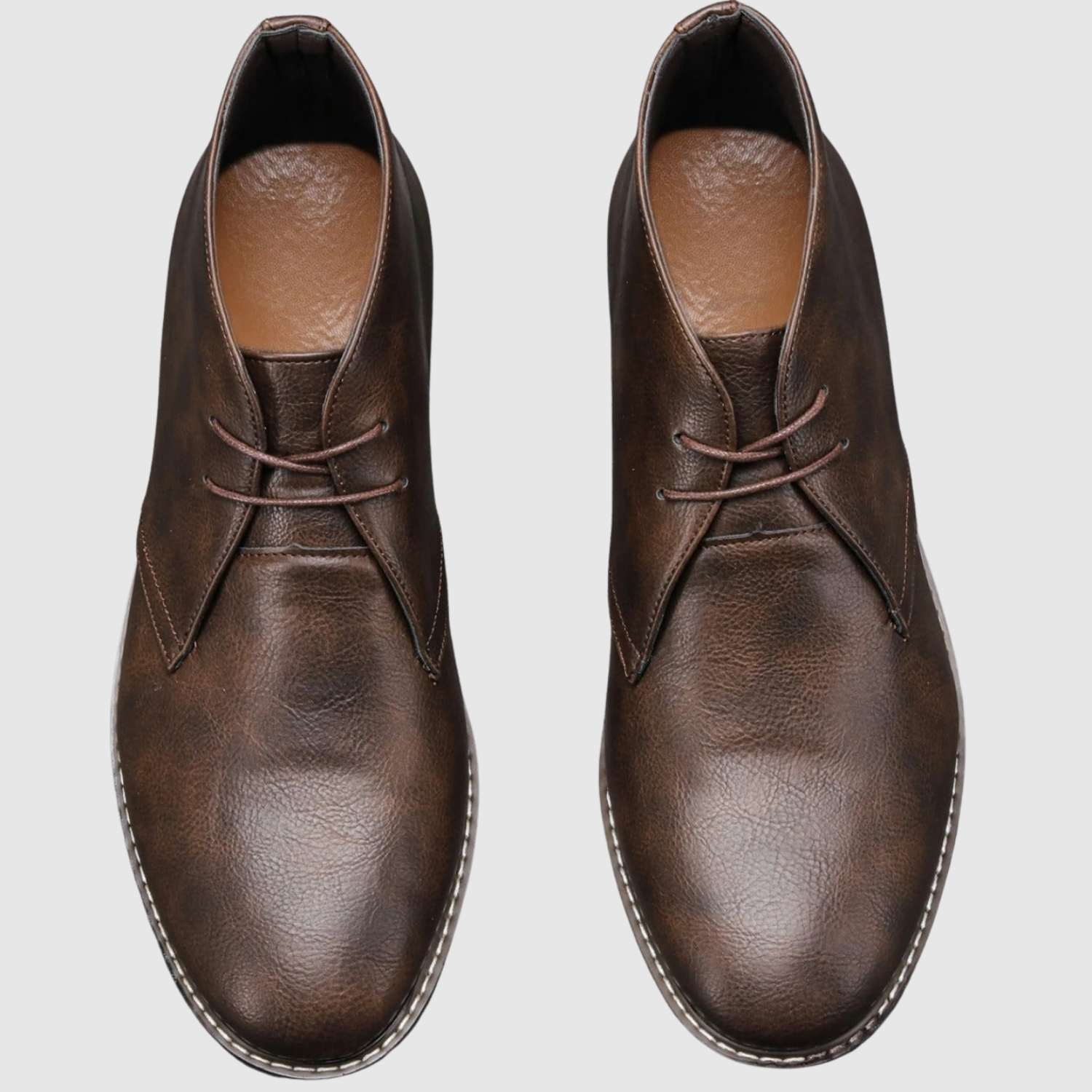 Objevte naše Chukka boty v tmavě hnědé kůži, které kombinují styl a komfort. S třemi otvory pro šněrování a lehkými podrážkami jsou ideální pro každodenní nošení i formálnější příležitosti.