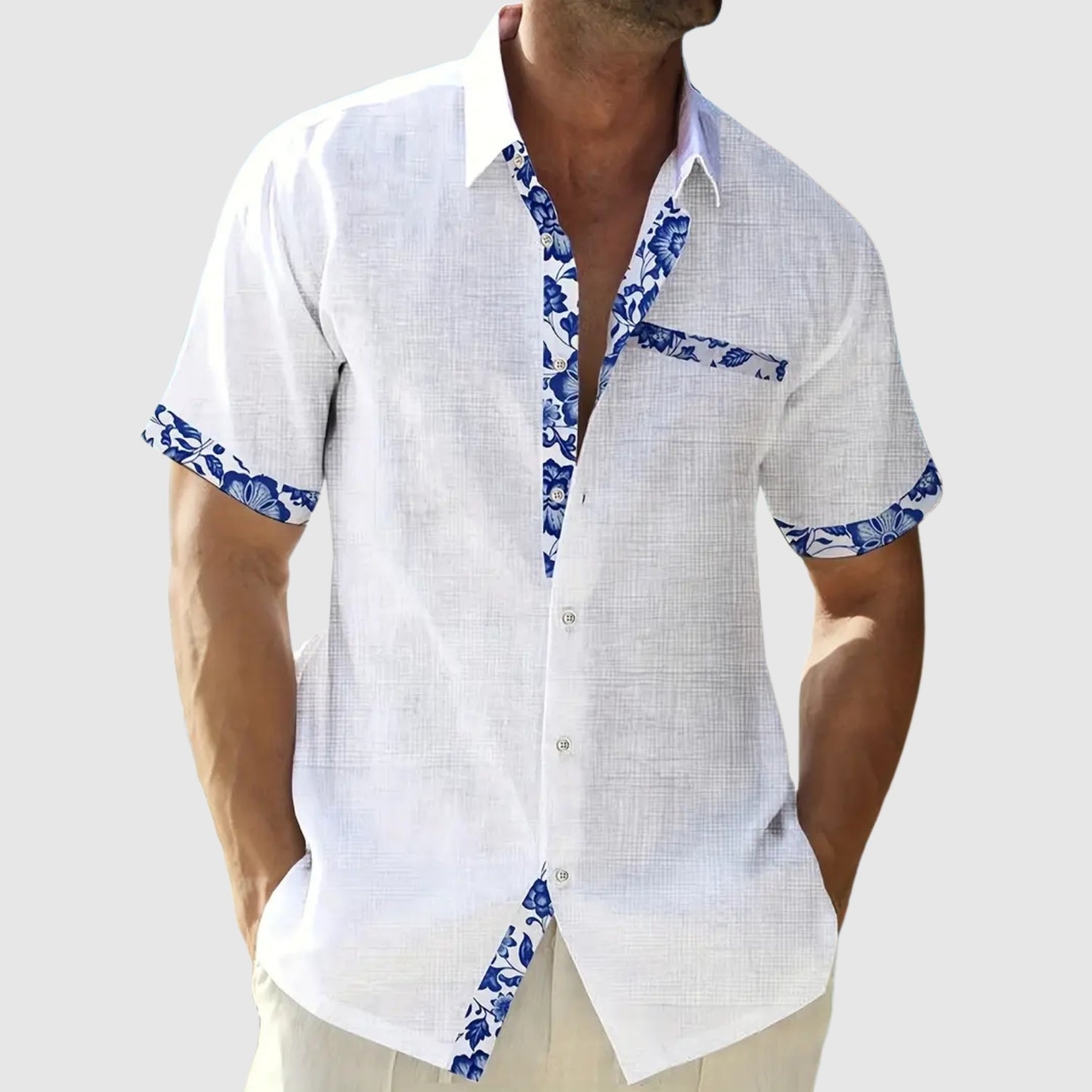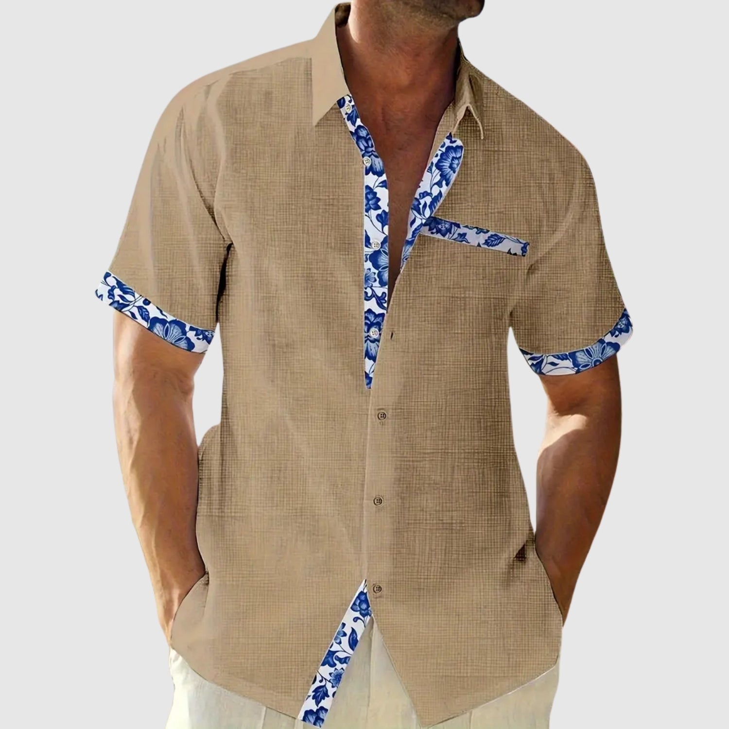 Objevte naši košili s krátkým rukávem, navrženou pro slunečné dny, která kombinuje svěžest a eleganci s živým dotykem. Kontrastní detaily na límci, kapse a rukávech dodávají charakter ležérnímu vzhledu, ideálnímu na pláž, do města nebo na letní výlet.