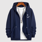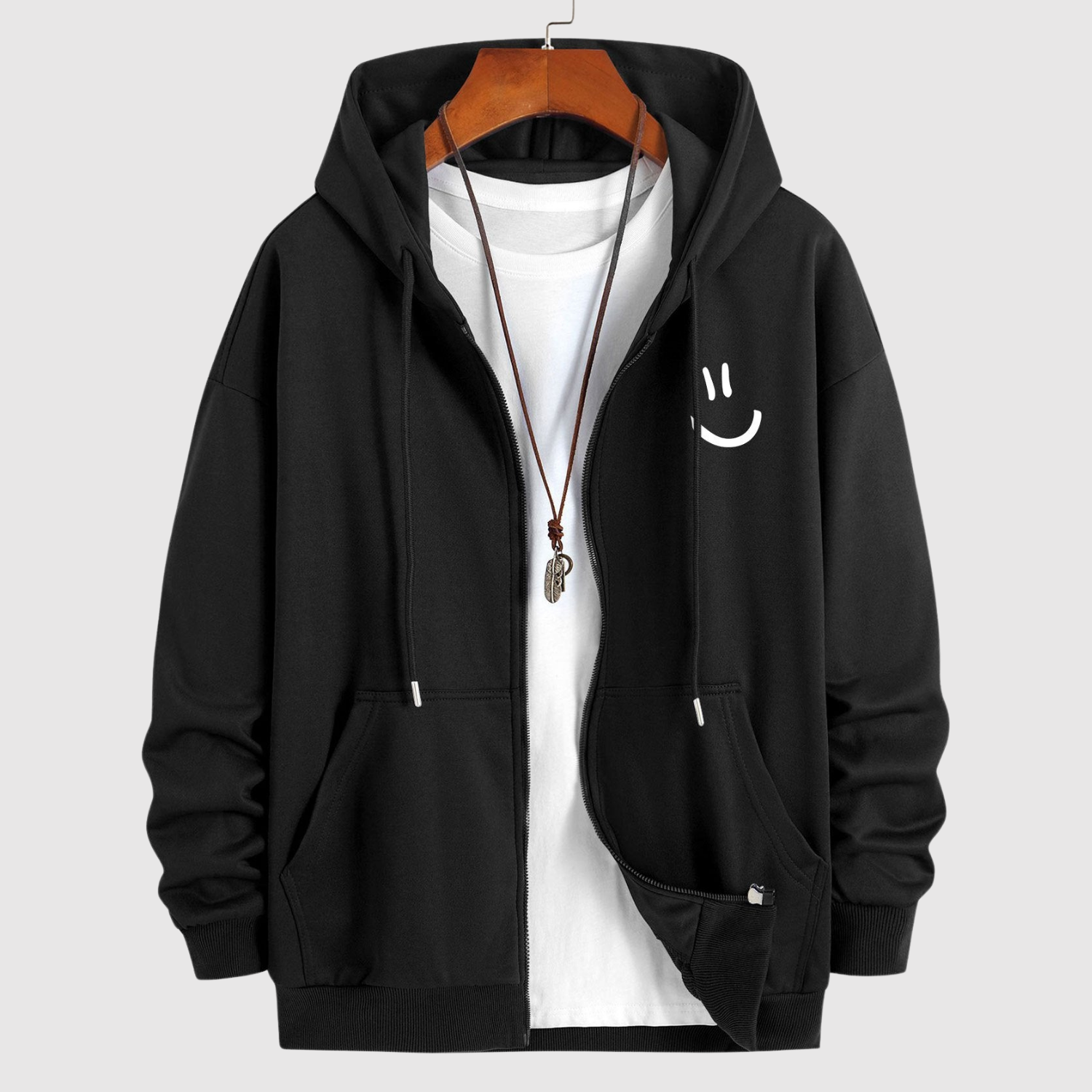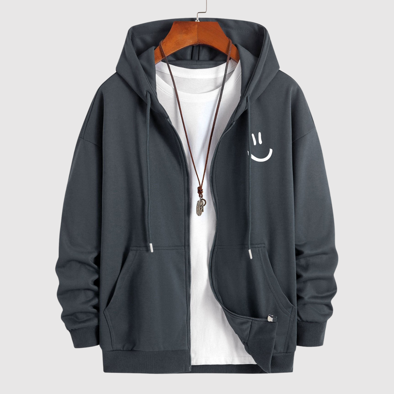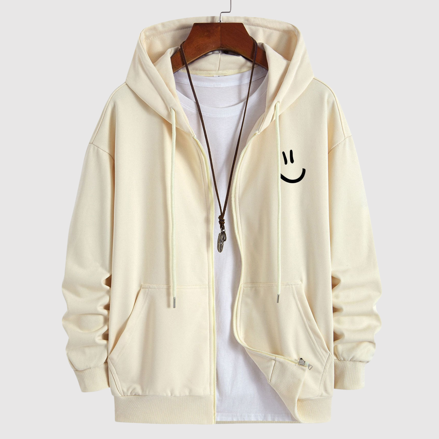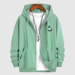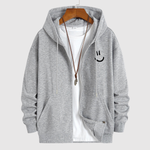 Tato mikina se zipem kombinuje volný střih s minimalistickým potiskem úsměvu, což jí dodává neformální a jedinečný vzhled. Ideální pro každodenní nošení a pohodlí – perfektní pro vrstvené oblečení během všech ročních období.