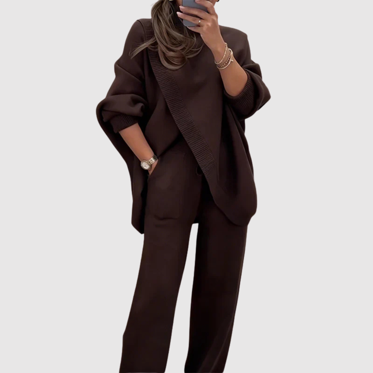 Měkký, pohodlný a elegantní set, který objímá tělo a zajišťuje dokonalý vzhled do kanceláře, na procházku nebo na setkání venku. Střih krásně padne, aniž by byl těsný, a moderní tóny dodávají prémiový pocit.