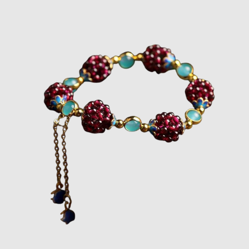 Liana – Umělecký náramek s červenými a modrými krystaly" can be rewritten as: "Liana – Umělecký náramek s krystaly v červené a modré barvě