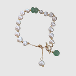 Tento náramek spojuje přírodní bílé perly s kamennými prvky ze zeleného aventurinu, symbolem štěstí a harmonie. Zlaté detaily a malý visací charm s perlou dodávají jemný a elegantní vzhled.