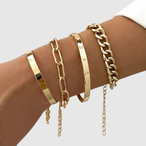 - Čtyři různé náramky – kombinace hladkých, řetízkových a otevřených designů