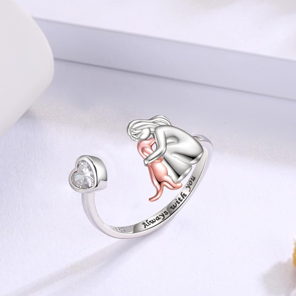 Tento jemný prsten s motivem dívky objímající psa a kočku je symbolem věrnosti, lásky a nezlomného pouta. Elegantní srdíčkový detail dodává designu hloubku – ideální pro všechny, kteří nosí své mazlíčky ve svém srdci.