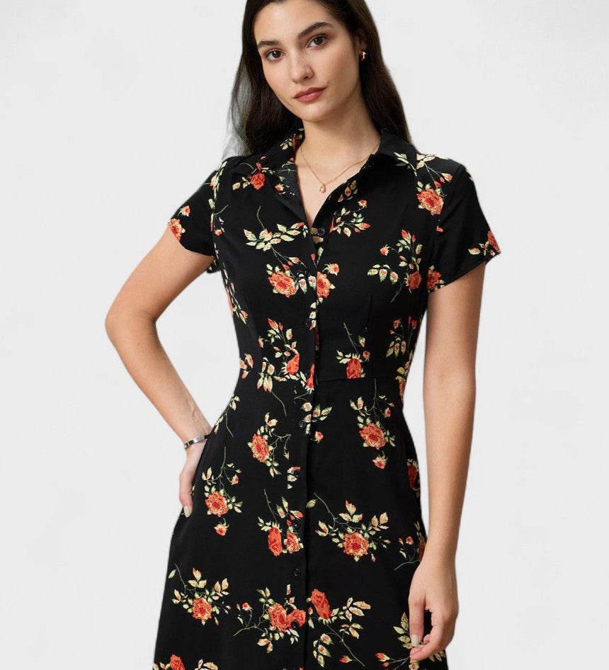 Glória | Černé midi šaty s květinovým potiskem