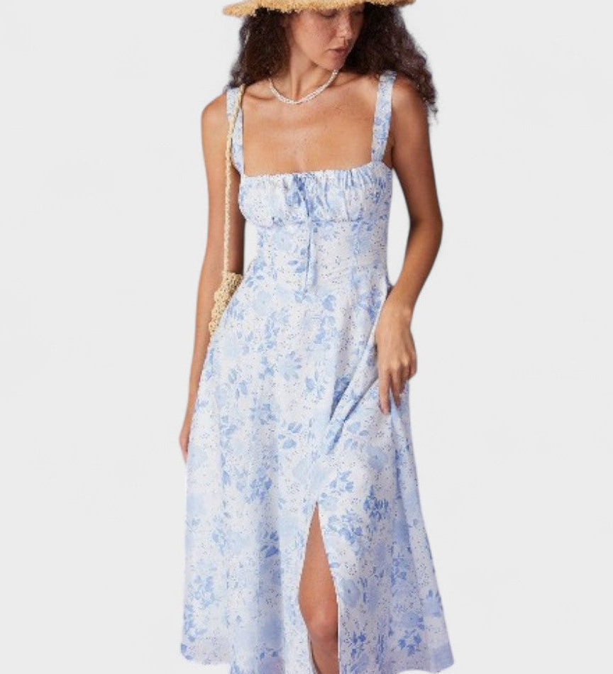 Renata | Modré midi šaty s květinovým vzorem, čtvercovým výstřihem a nařasením