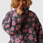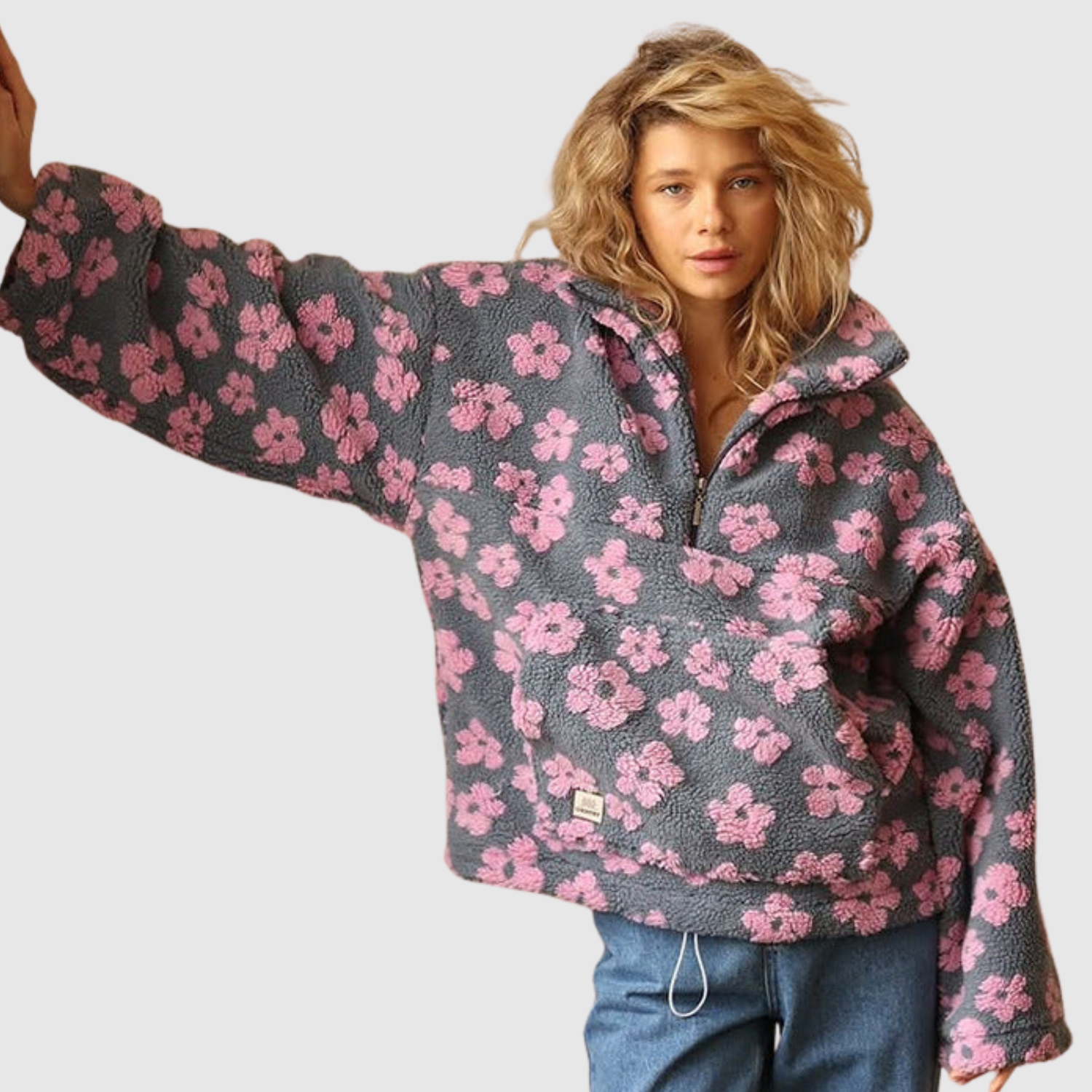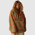 Tento fleece kombinuje měkký materiál s hravým barevným potiskem, který dodává svěží a ženský vzhled. Volný střih a polozip ho činí ideálním pro každodenní nošení, ať už uvnitř nebo venku.