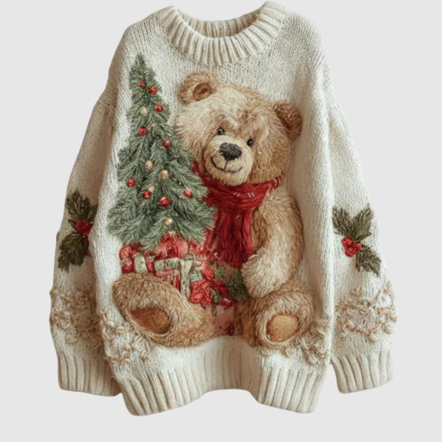 Teplý a zábavný vánoční svetr je ideální volbou pro chladné období! S okouzlujícím motivem medvídka, dárků a zimních prvků, tento svetr vytváří útulný a veselý vzhled.