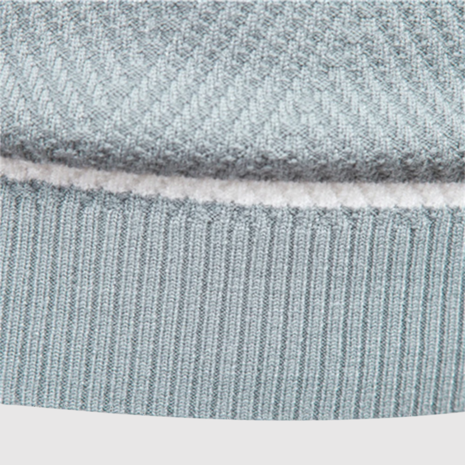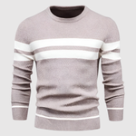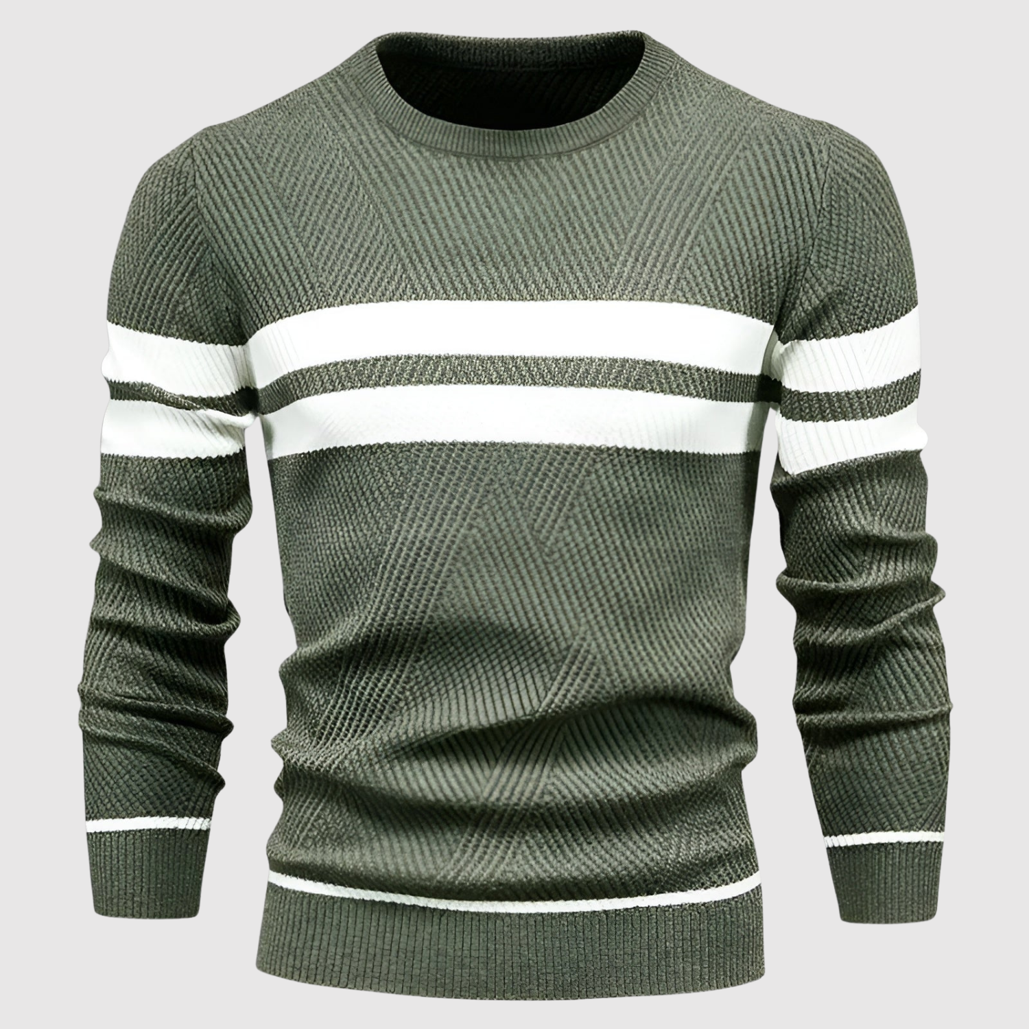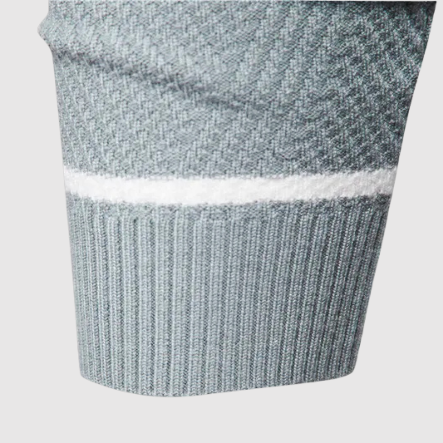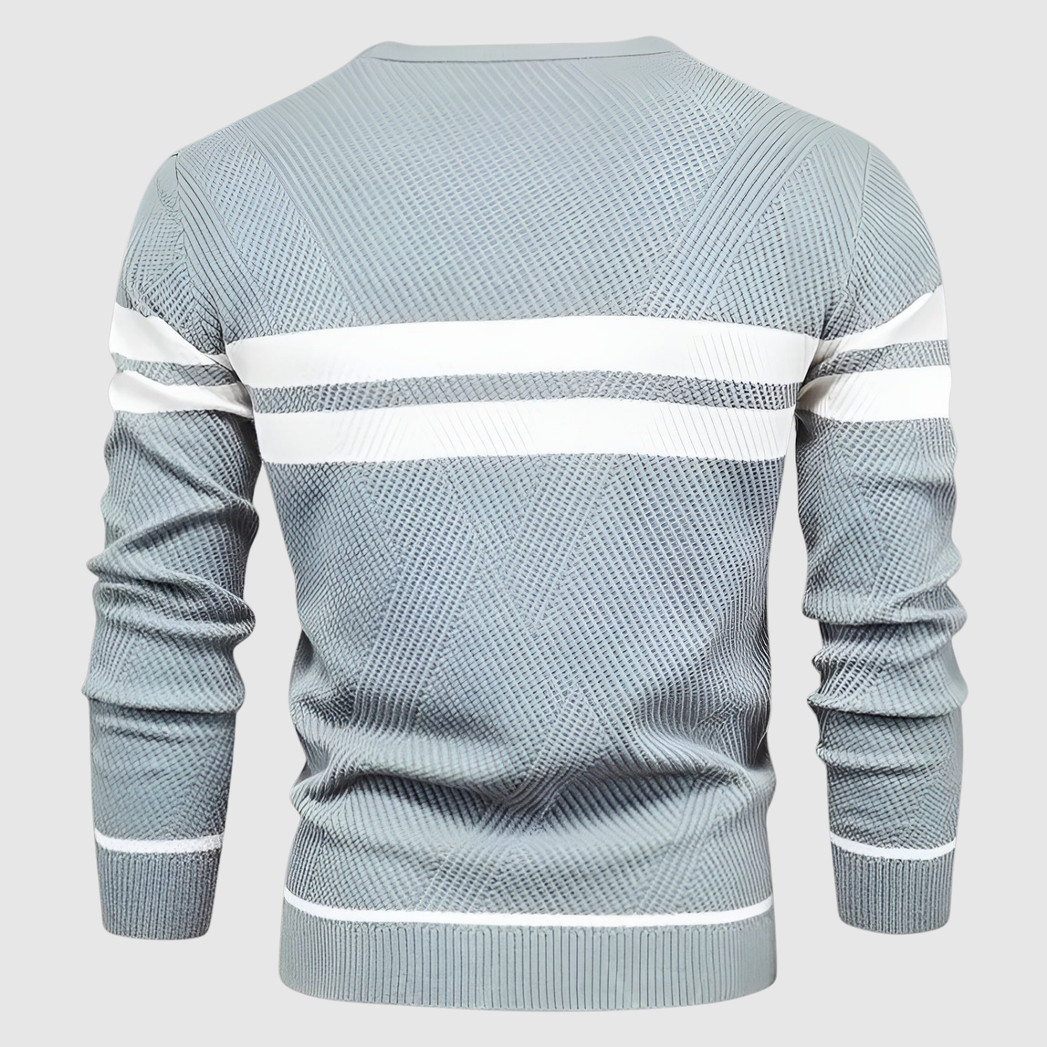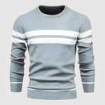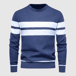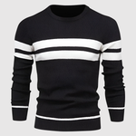 Objevte náš moderní pulovr z měkkého úpletu, který se pyšní výraznými bílými kontrastními pruhy na hrudi a rukávech. Tento design kombinuje nadčasový styl se sportovní elegancí, což ho činí univerzálním kouskem pro každodenní nošení a méně formální příležitosti.