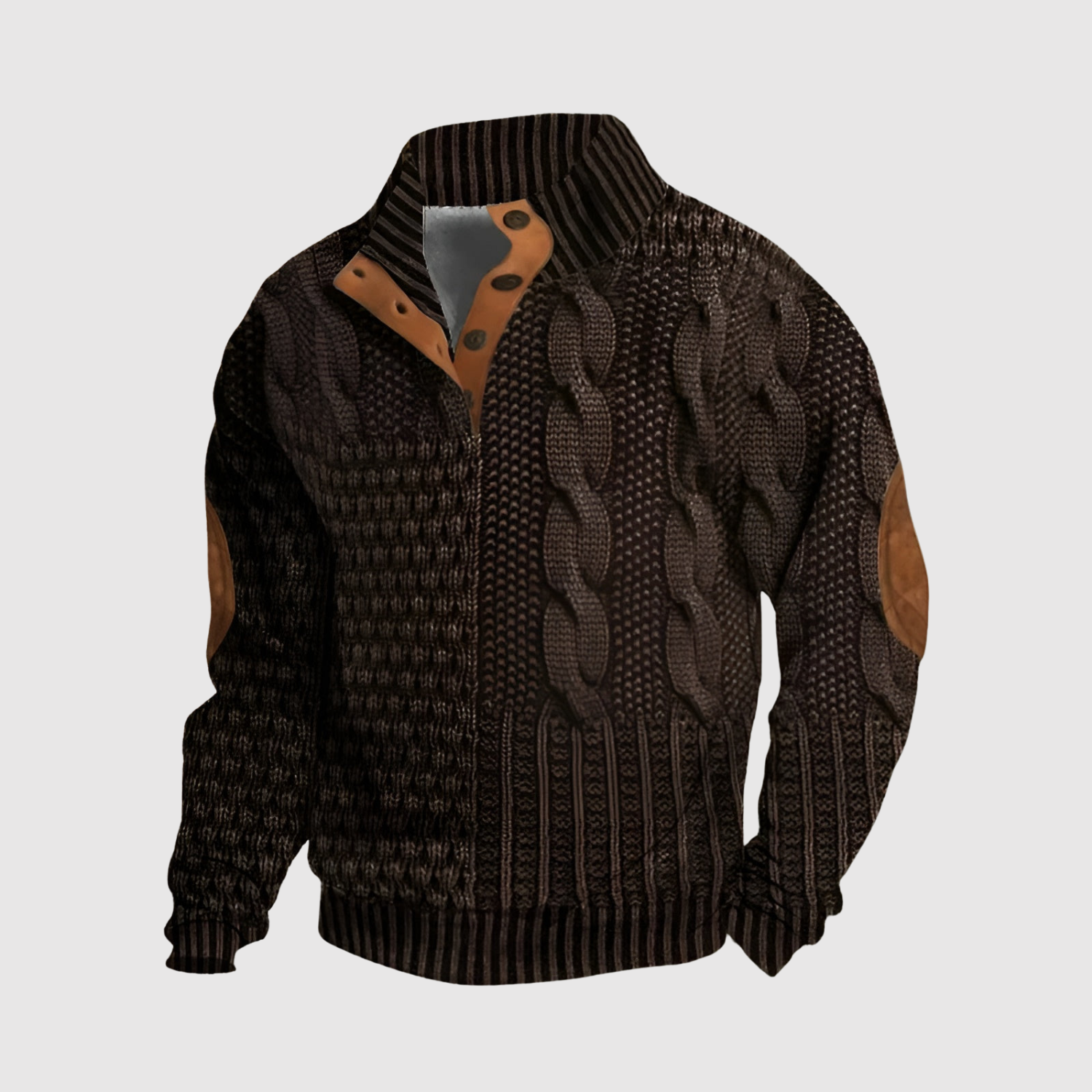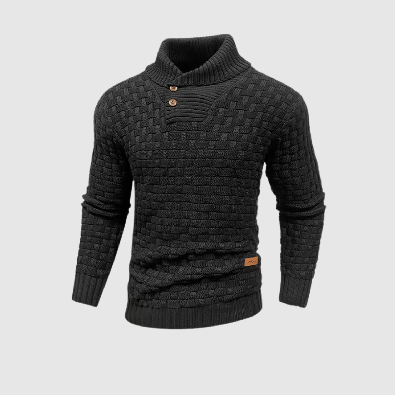 Daniel – Pánský pletený svetr s knoflíky a vysokým límcem" can be rewritten as: "Daniel – Pánský svetr s pleteným vzorem, knoflíky a vysokým límcem