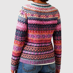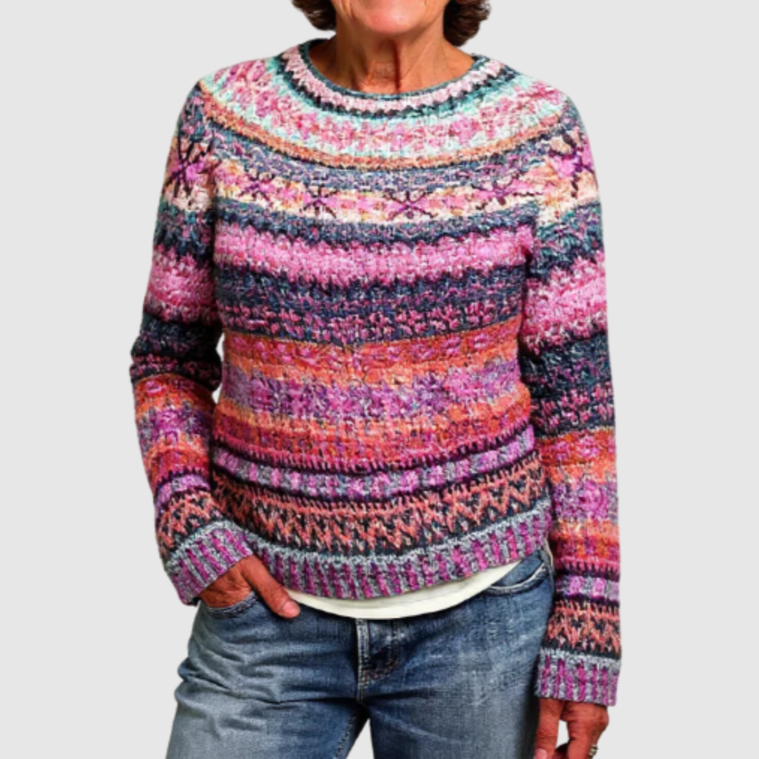 Tento svetr ohromuje svou jedinečnou kombinací barev a měkkým, útulným pletením. Perfektní volba na podzimní a zimní dny, přináší komfort a dodává špetku uměleckého kouzla každému vzhledu.