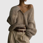 Tento pletený svetr přináší výjimečný a útulný vzhled díky svému hřejivému materiálu. Jeho volný střih a elegantní design ho činí ideálním pro neformální dny i stylové příležitosti.