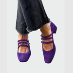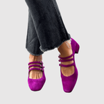 Objevte fialové baleríny s trojitými pásky, které spojují eleganci a hravost. Čtveratá špička a nízký podpatek zajišťují stabilitu a komfort po celý den.