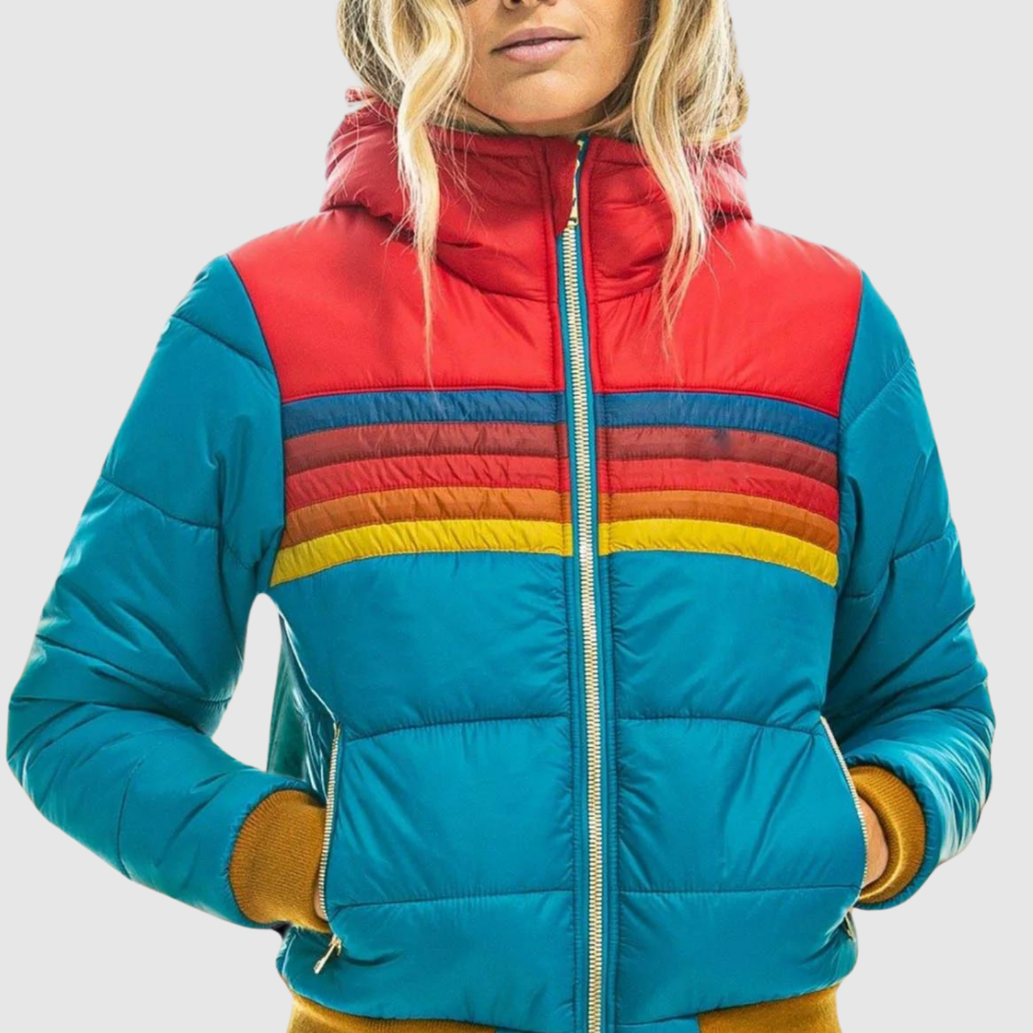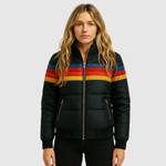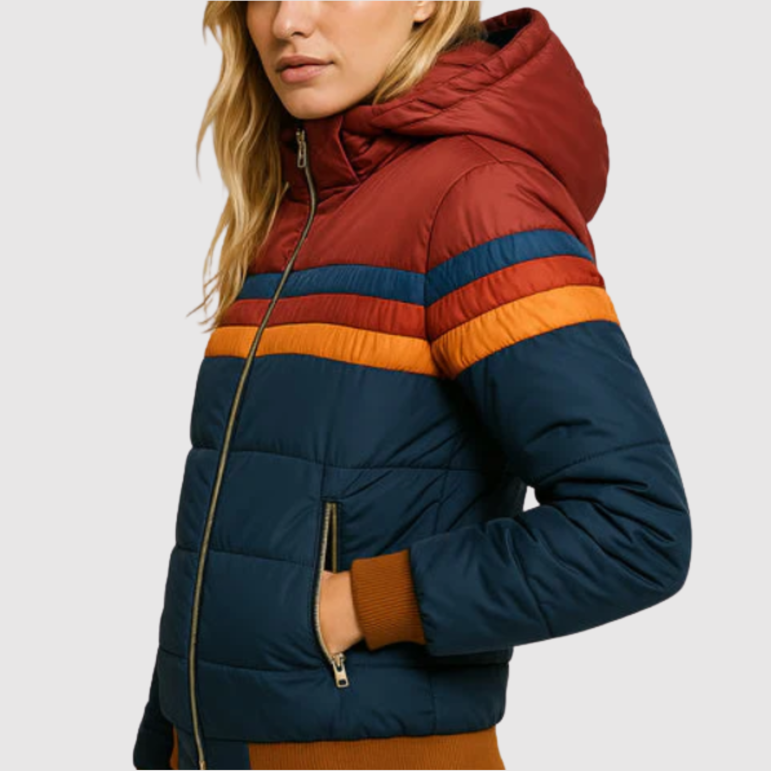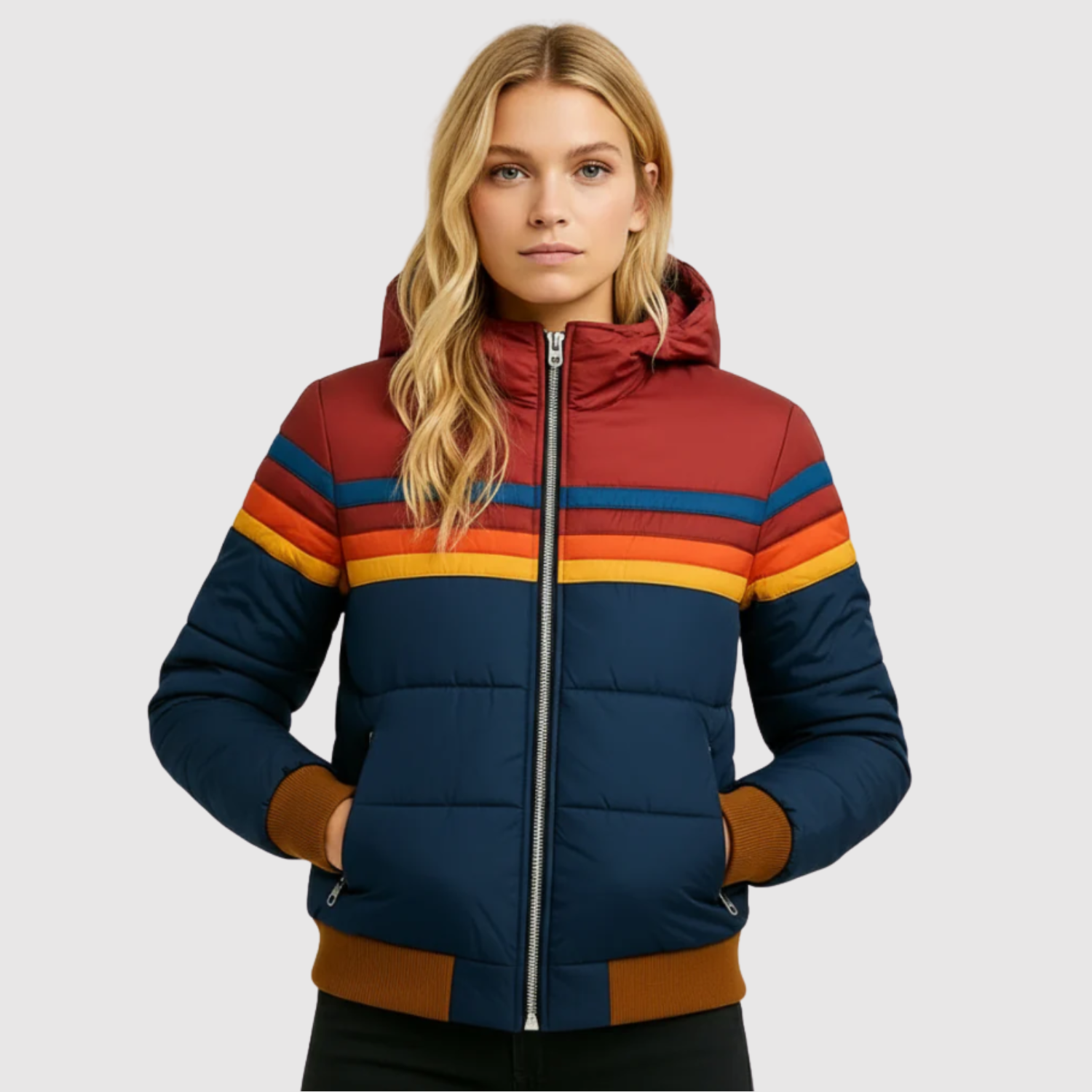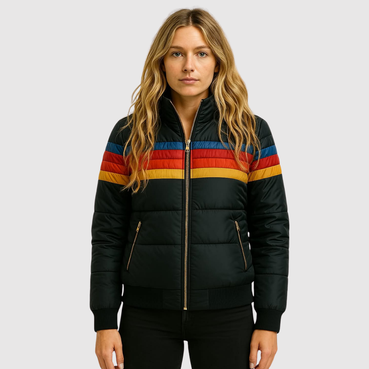 Tato bunda spojuje sportovní inspiraci s teplým, podšitým designem. Barevné pruhy jí dodávají jedinečný retro vzhled, zatímco měkká izolace chrání před chladem. Ideální pro každodenní nošení a venkovní aktivity během přechodných a zimních měsíců.
